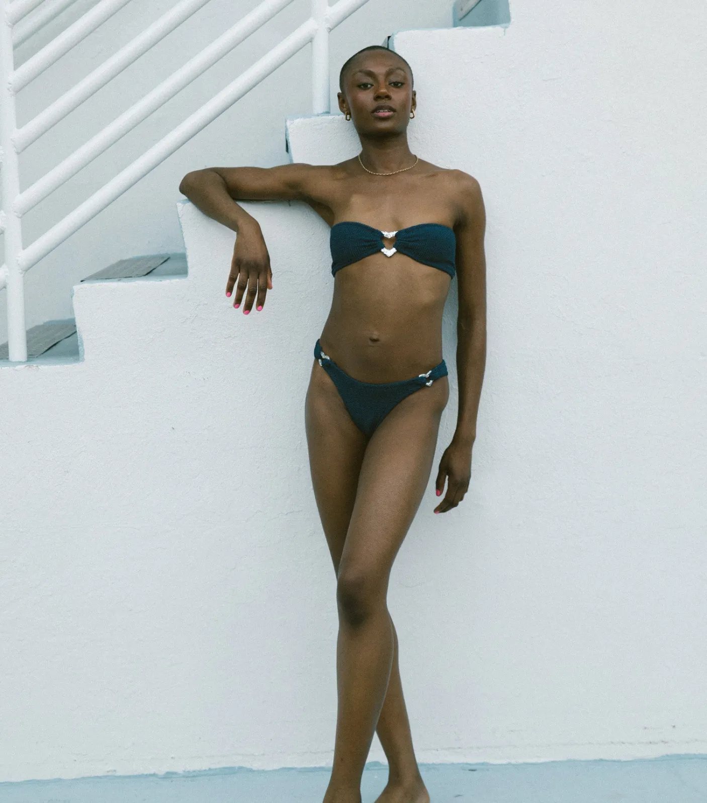 The noughties are calling. Keep it playful with Nicole’s bandeau bikini cut and glitter heart detailing.