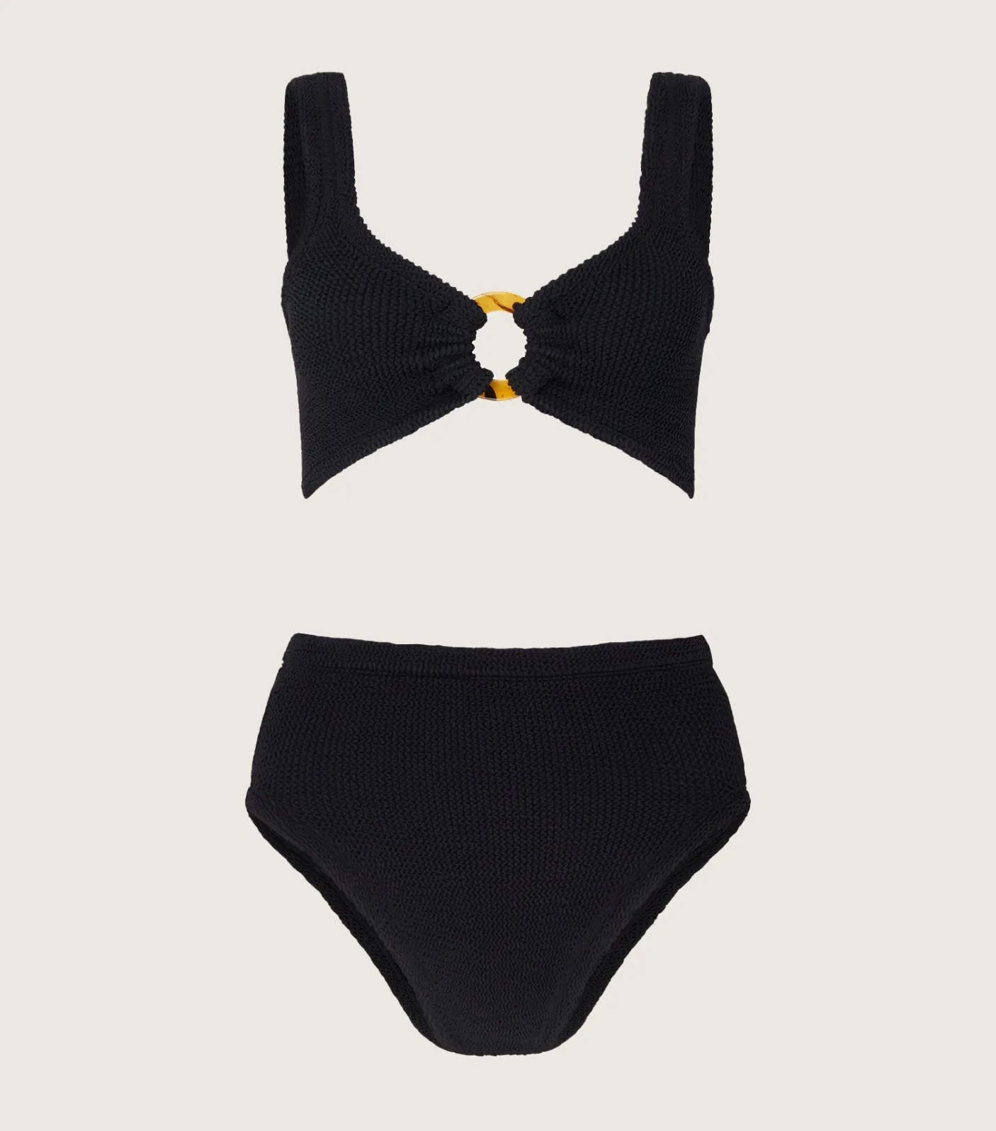 She’s got it all. Nadine’s high-waisted bikini bottoms and tortoiseshell hoop detailing have comfort with a serving of understated glamour.