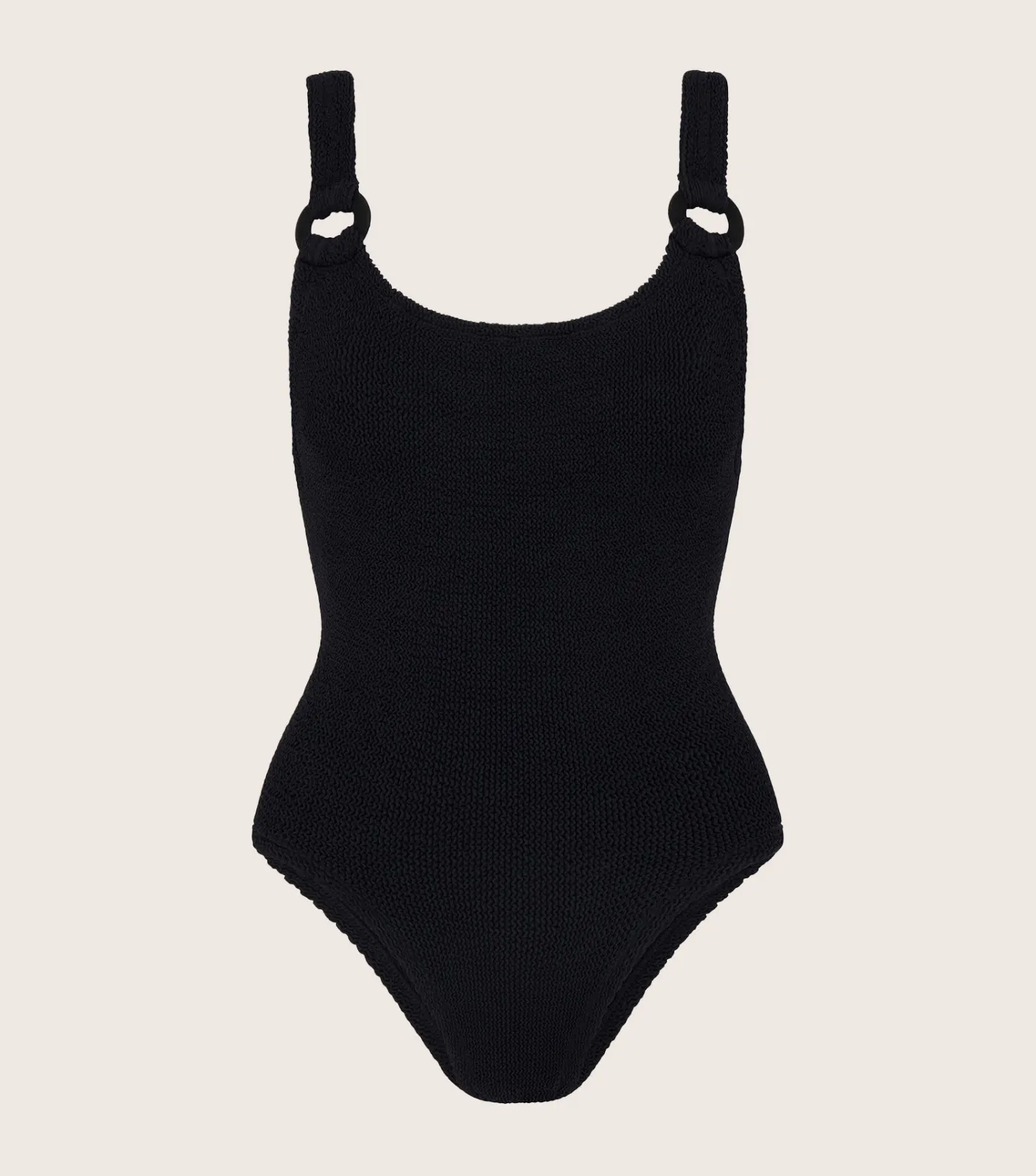 The style that crashed our site. Our iconic dipped neck, scooped back Domino swimsuit, now reimagined with chic tonal hoop detailing. A modern take on an old friend.