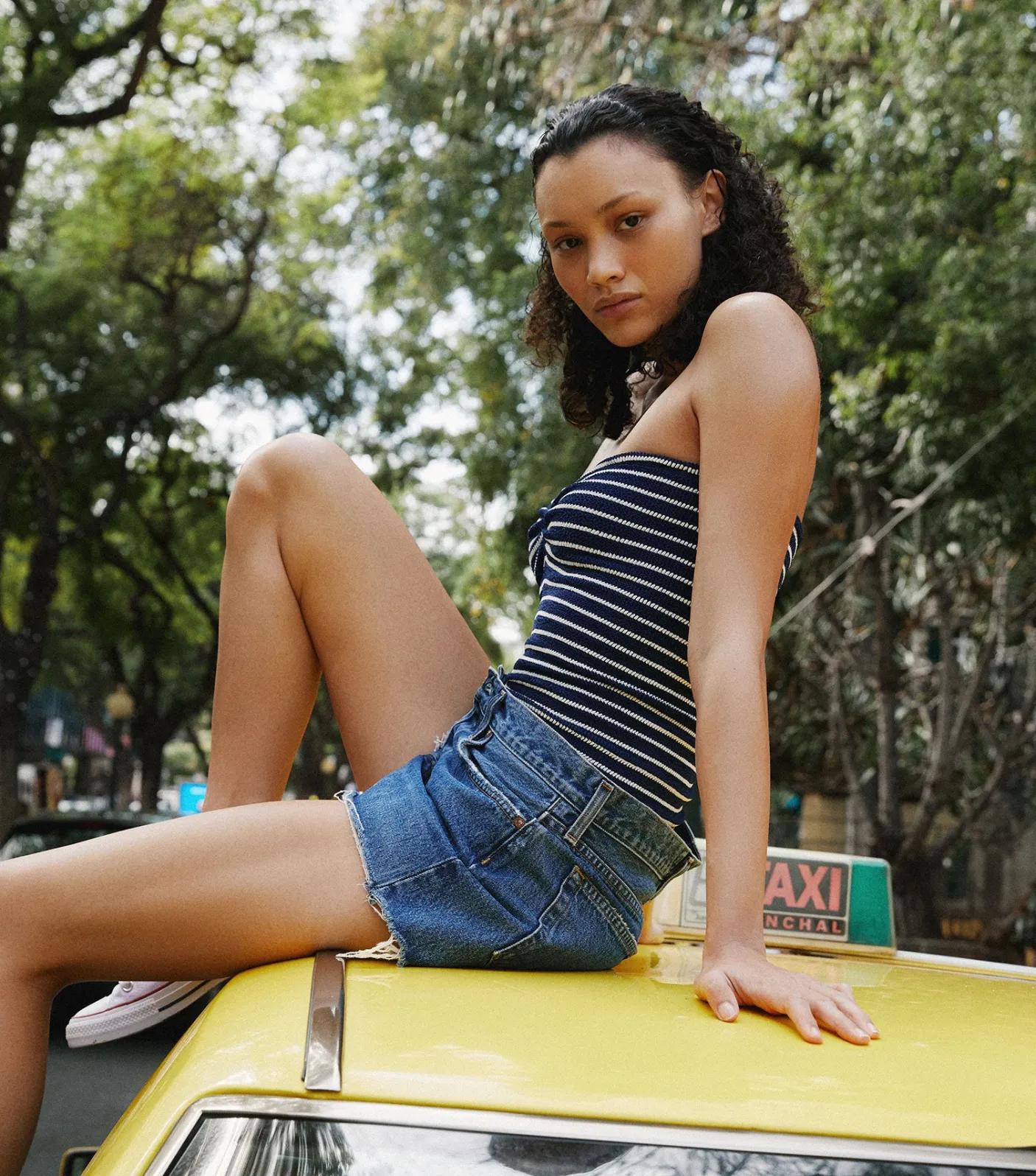 Strictly no tan lines in this strapless style. Minimal meets glam with the Brooke swimsuit’s ruched sweetheart neckline and figure-sculpting silhouette now in our iconic stripe.